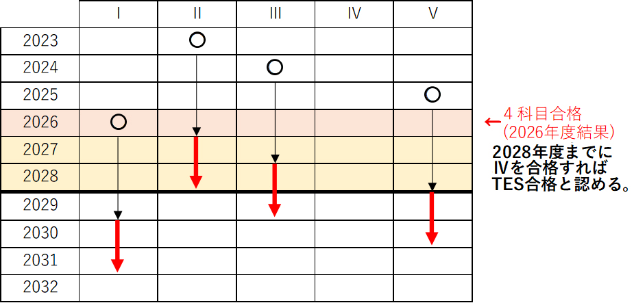 例:下記の図の場合、有効期限が最も早く切れるのはⅡです。それぞれ2年ずつ延長されるので、2028年度試験までに残りの科目(この場合はⅣ)に合格すればTES資格取得可能です。