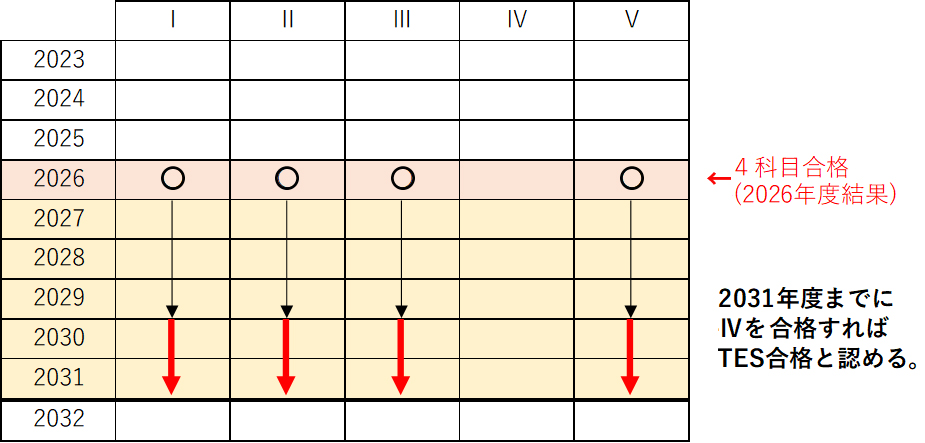 例:下記の図の場合、有効期限が最も早く切れるのはⅡです。それぞれ2年ずつ延長されるので、2028年度試験までに残りの科目(この場合はⅣ)に合格すればTES資格取得可能です。